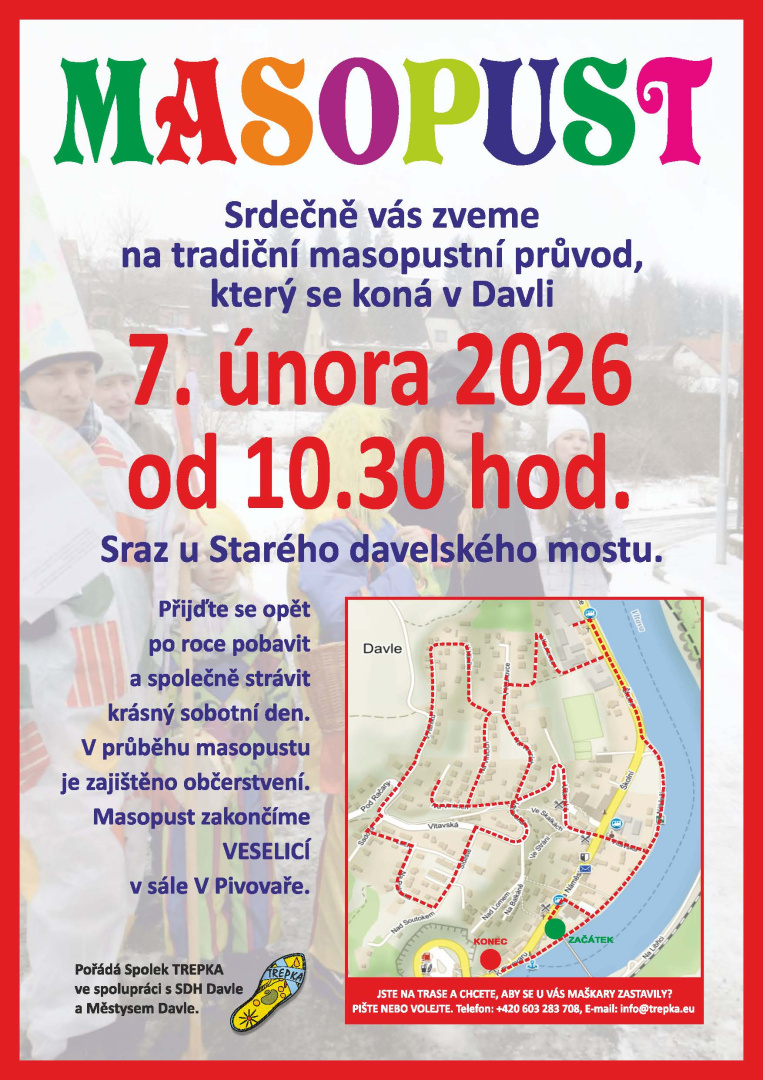 Zveme vás na masopustní průvod 7. února 2026, který začne v 10:30 u Starého davelského mostu.