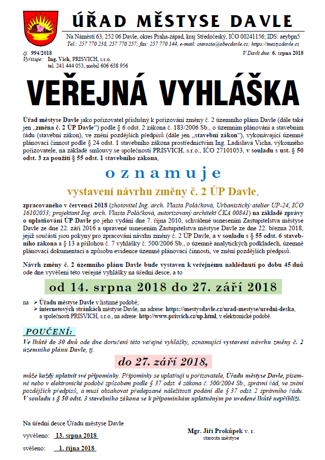vystavení návrhu změny č. 2 ÚP Davle, zpracovaného v červenci 2018 (zhotovitel Ing. arch. Vlasta Poláčková, Urbanistický atelier UP-24, IČO 16102053; projektant Ing. arch. Vlasta Poláčková, autorizovaný architekt ČKA 00841) na základě zprávyno uplatňování ÚP Davle po jeho vydání dne 7. října 2010, schválené usnesením Zastupitelstva městyse Davle ze dne 22. září 2016 a upravené usnesením Zastupitelstva městyse Davle ze dne 22. března 2018, jejíž součástí jsou pokyny pro zpracování návrhu změny č. 2 ÚP Davle, a v souladu s § 55 odst. 6 stavebního zákona a § 13 a přílohou č. 7 vyhlášky č. 500/2006 Sb., o územně analytických podkladech, územně plánovací dokumentaci a způsobu evidence územně plánovací činnosti, ve znění pozdějších předpisů.