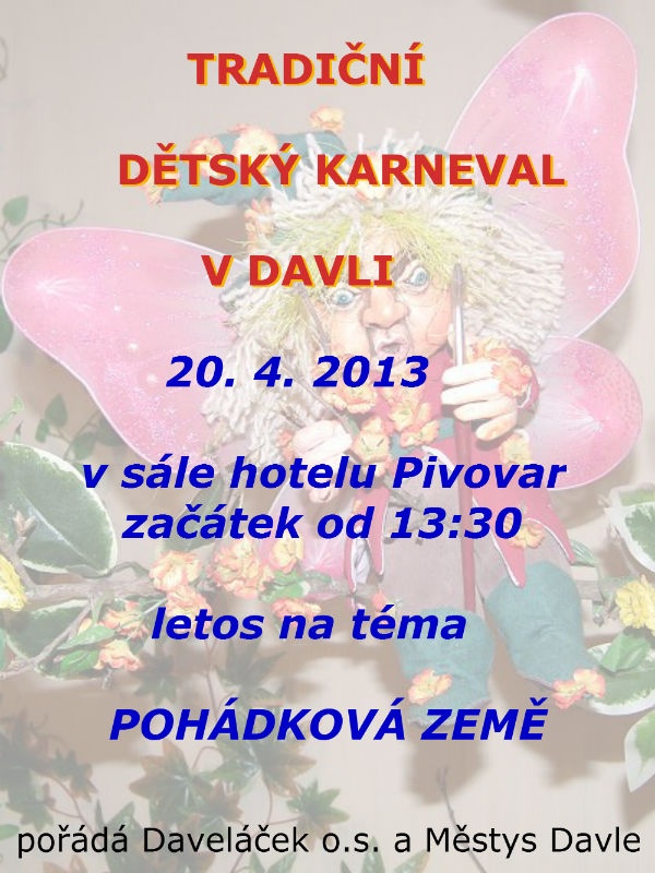 20.4. od 13:30 se v Davli v sále hotelu Pivovar koná tradiční Dětský karneval. Tentokrát na téma Pohádková země. Karneval budou provázet Naďa Konvalinková, Víťa Klimtová (pohádkový dům v Pičíně), Pavel Půta - potulný muzikant